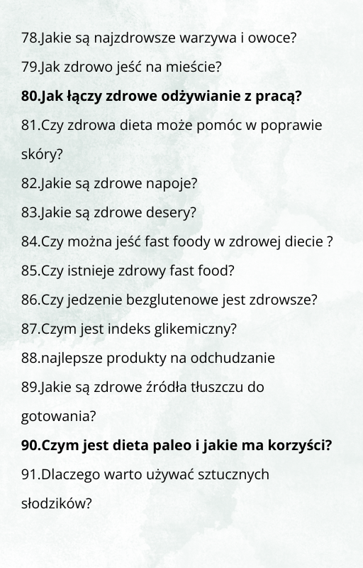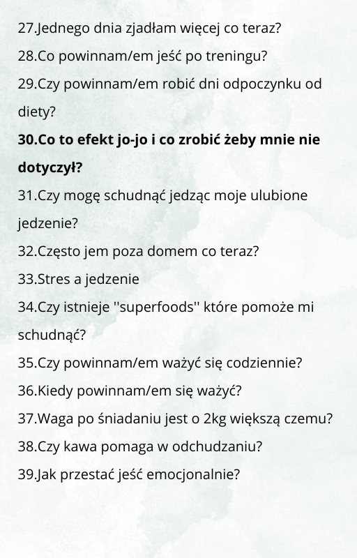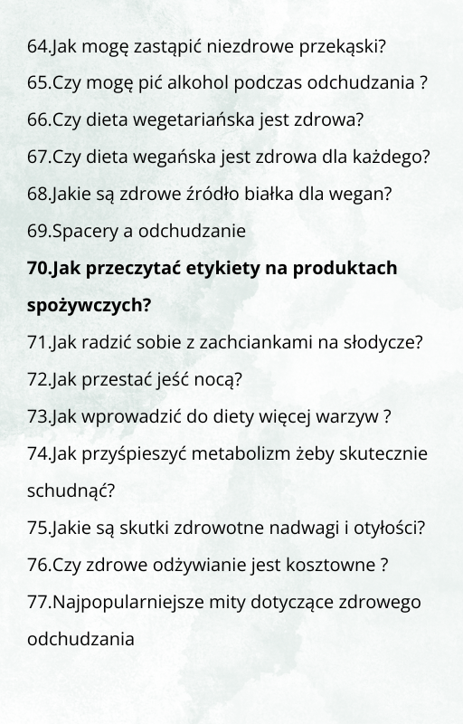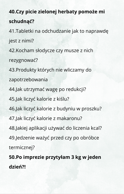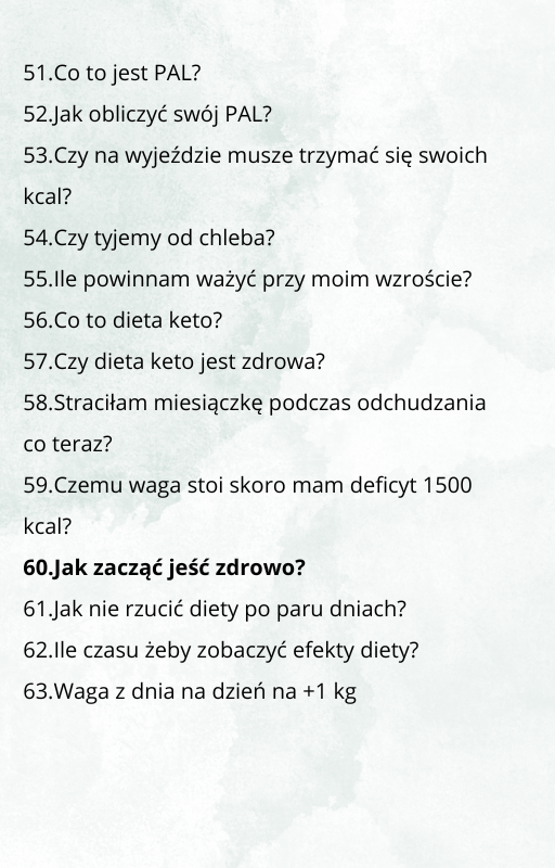 101 Pytań do odchudzania to e-book w którym zawarłam odpowiedzi na najczęstsze i te bardziej nietypowe pytania, które mi zadajecie przez prawie 4 lata na instagramie. Ten e-book wyjaśnia zagadnienia dotyczące odchudzania, które są napisane łatwym językiem, dzięki czemu niezależnie od Twojej wiedzy dietetycznej będziesz miała większą wiedzę o odchudzania, co przybliży Cię do wymarzonej sylwetki
